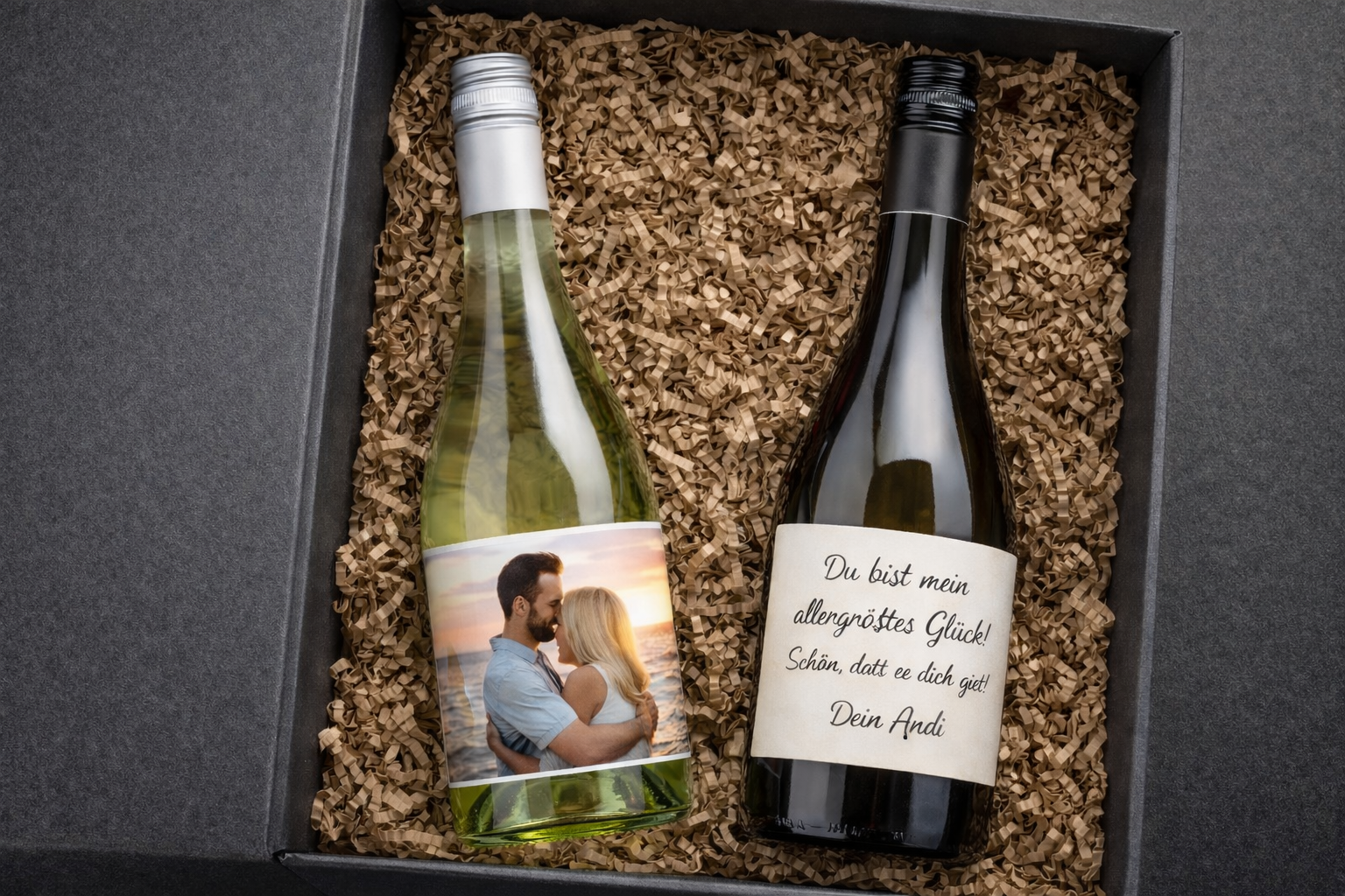 1 Flasche Secco und eine Flasche Sauvignon blanc Meisterwerk in der Geschenkbox inkl. Sonderetikett mit Ihrem Wunschfoto und Ihrer Liebesbotschaft. Senden Sie uns dazu bitte nach dem Bestellvorgang eine E-Mail an info@weingeister.de mit Ihrem Foto und Ihrem Wunschtext.